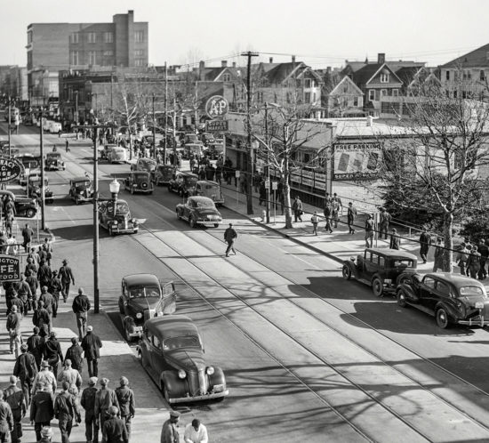 Trabajadores de astilleros saliendo del trabajo a las 4 p.m. Virginia. EEUU. 1941 In Factorias industriales