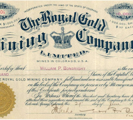 Acción minera de la Royal Gold Mining Company Limited, Colorado, USA. Año 1898.