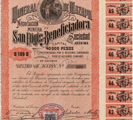 Acción de la Negociación Minera de San Eligio o La Beneficiadora, Mazapil, estado de Zacatecas, México. Año 1894. Por AHM 10 abril, 2013 Acciones mineras · México ·