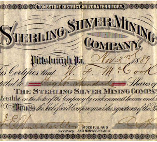 Acción minera de la Sterling Silver Mining Company, Tombstone District, Arizona, USA. Año 1889. In Acciones mineras / Estados Unidos
