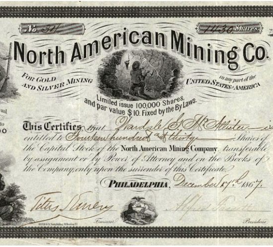 Acción minera de la North American Mining Company, Philadelphia, Pennsylvania, USA. Año 1867. In Acciones mineras / Estados Unidos