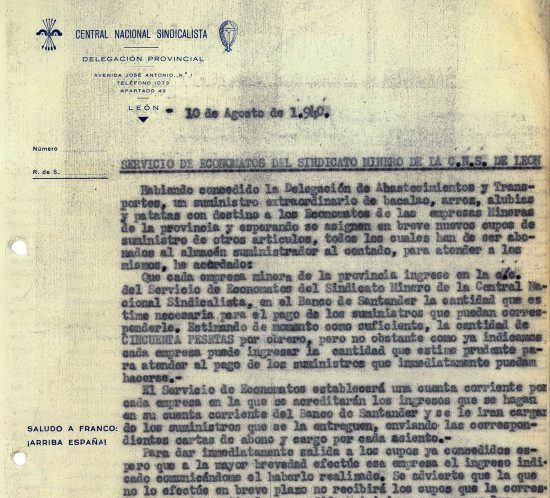 Circular de la Central Nacional Sindicalista, sobre el servicio de economatos. Año 1940. Tomo 5. Doc 10. 1 página In Documentos / Fundación Cultura Minera