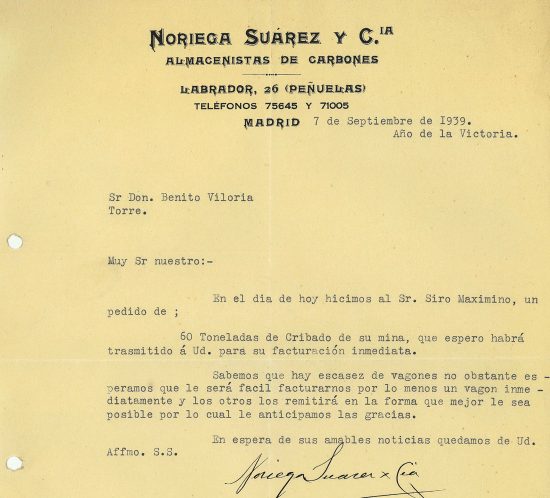 Correspondencia Comercial entre Noriega Suarez y Cia. y Benito Viloria. Año 1939. Tomo 5. Doc 12. 1 página In Documentos / Fundación Cultura Minera