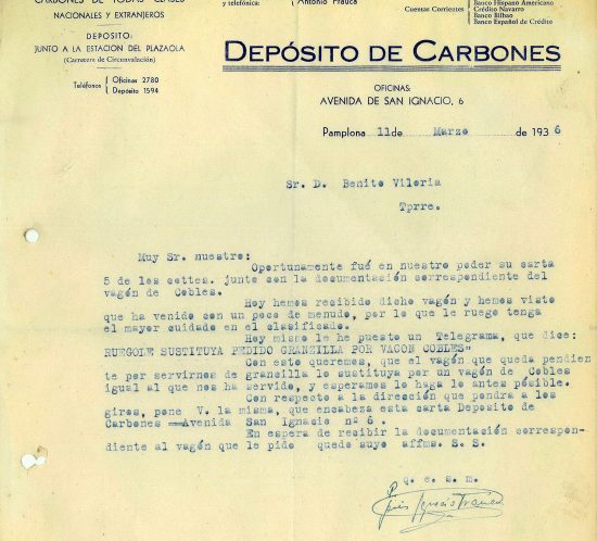 Correspondencia Comercial entre Deposito de Carbones Antonio Frauca y Benito Viloria. Años 1936 a 1938. Tomo 5. Doc 8. 3 páginas In Documentos / Fundación Cultura Minera