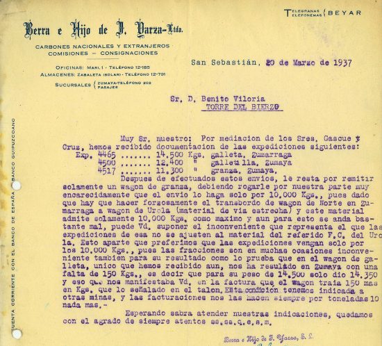 Correspondencia comercial entre Berra e Hijo de J. Darza y Benito Viloria. Año 1937. Tomo 5. Doc 9. 2 páginas In Documentos / Fundación Cultura Minera