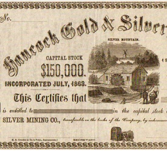 Acción minera de la Hancock Gold and Silver Mining Company, Silver Mountain, Nevada, USA. Año 1864. In Acciones mineras / Estados Unidos